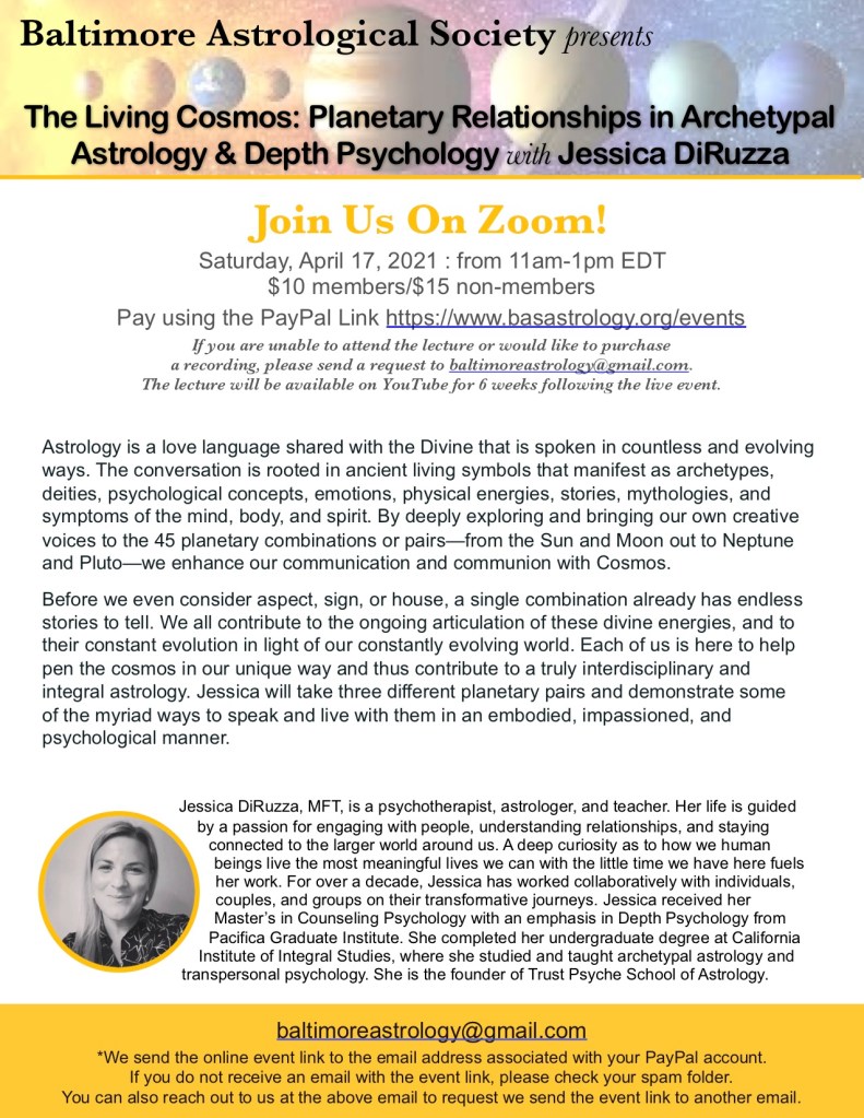 Happy Equinox! I am thrilled to be speaking at the Baltimore Astrological Society next month on Saturday, April 17th. I cordially invite you to come hear me speak on “The Living Cosmos: Planetary Relationships in Astrology and Depth Psychology”. This will be an enlivening talk on some of my favorite astrological topics. We will have a lot of fun! I would love to see your familiar face.