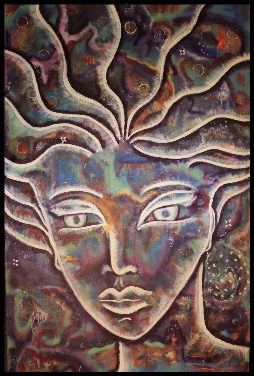 The painting I am standing in front of is called, “The Cosmic Muse” created by Danna Clare from Enchanted Realism at dannaclare.com. Danna is a beloved student of mine who is a phenomenal creative artist and guide for people who want to embody an enchanted life through astrology and creativity. I am honored to have Cosmic Muse in my home and in my life.