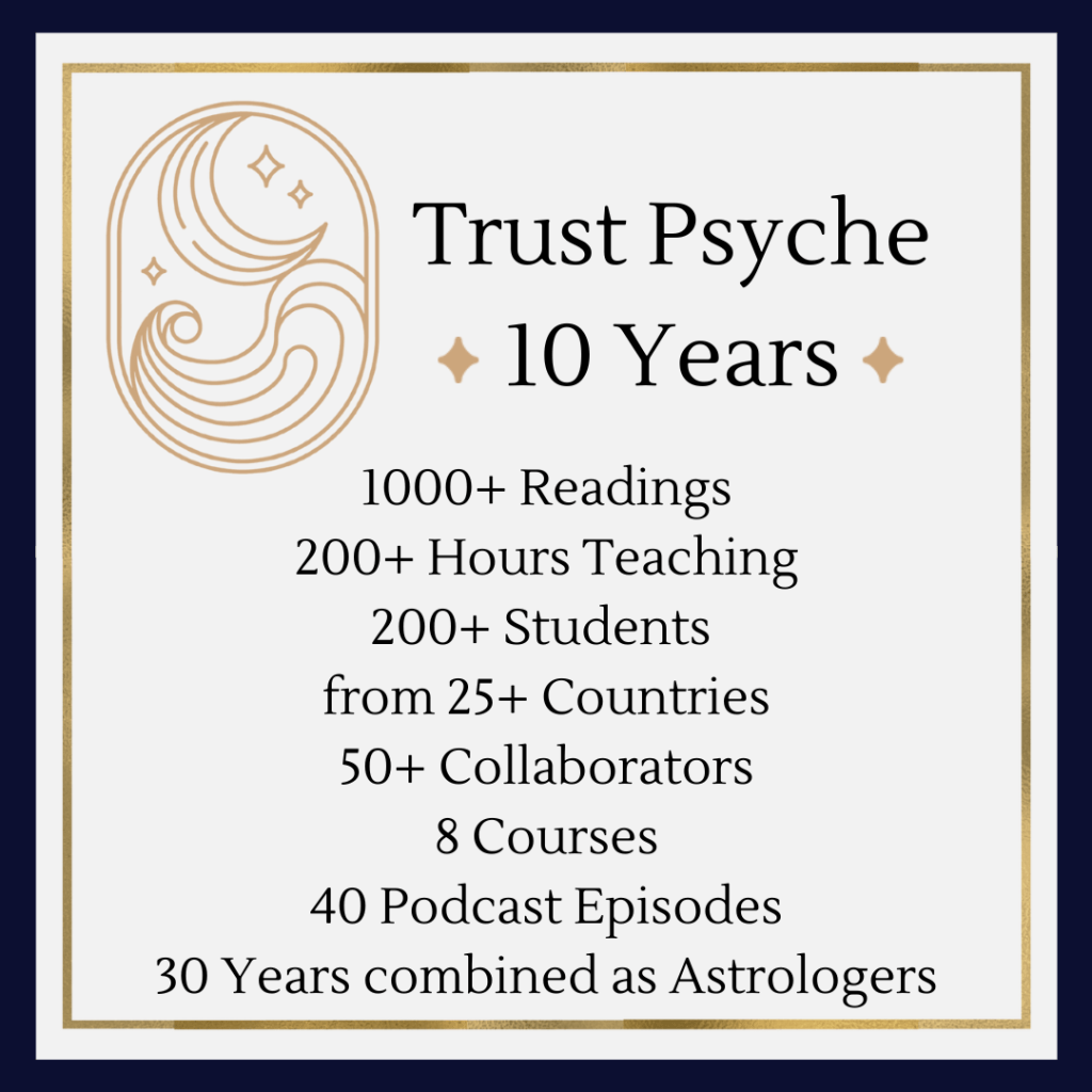 We are celebrating our 10th anniversary of Trust Psyche! As we share in the podcast, when we looked back over what we have co-created, the above is what we saw. Thank you for celebrating with us. Stay tuned, there’s more to come!