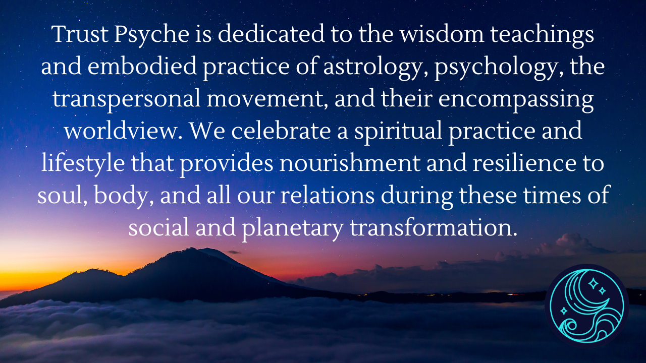 I received my Master’s in Counseling Psychology with an emphasis in Depth Psychology from Pacifica Graduate Institute, where I wrote my thesis on shame and the reclamation of the feminine voice. I did my bachelor’s at California Institute of Integral Studies where I studied and taught archetypal astrology and transpersonal psychology. You can find my body of work here at TrustPsyche.com, and on my YouTube channel, and @trust.psyche on IG. Together with my husband, Travis, we co-founded The Trust Psyche School of Astrology and Depth Psychology, which offers a full astrological curriculum, from beginner to professional, with a beloved community of students from over 25 countries. We would love for you to come live astrology with us.