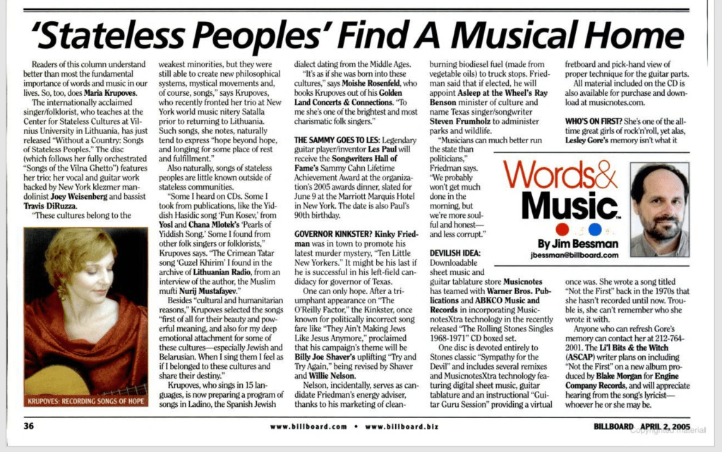 Without a Country: Songs of Stateless Peoples collects music from cultures who lack political representation at the level of the nation-state. The album was recorded in Vilnius, Lithuania with Maria Krupoves (voice/guitar), Joey Weisenberg (mandolin), and Travis DiRuzza (bass). Read our write-up in Billboard magazine below: